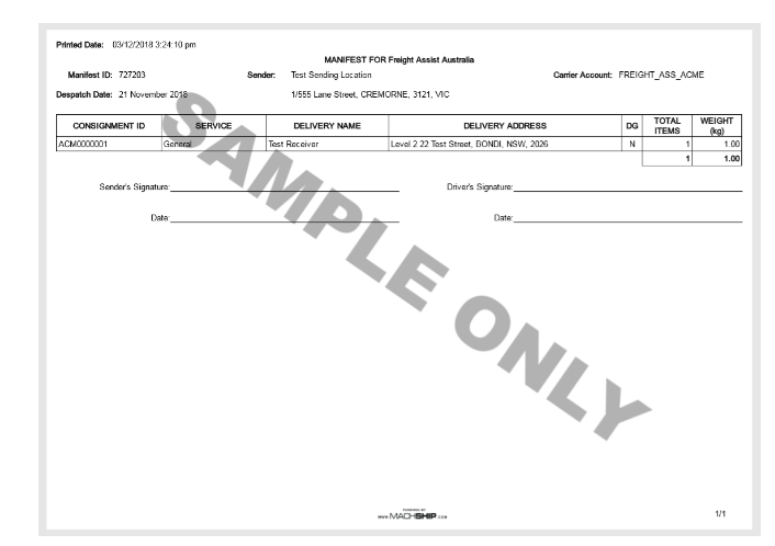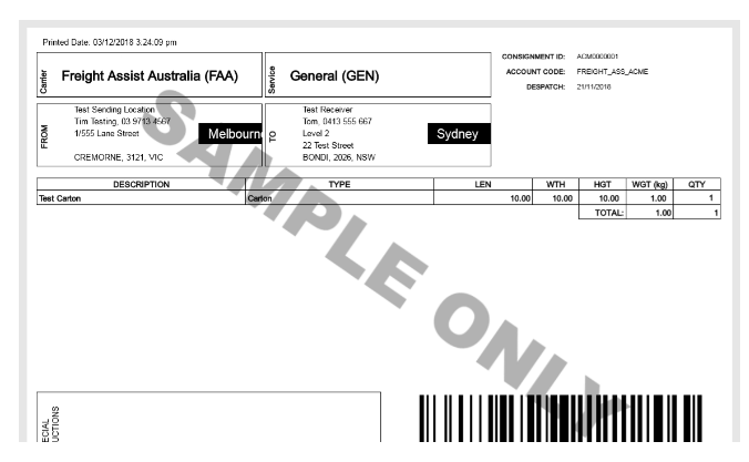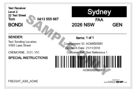 If you notice a SAMPLE ONLY watermark across your documents. This is due to using the wrong system. Please ensure you are in live.machship.com.