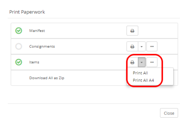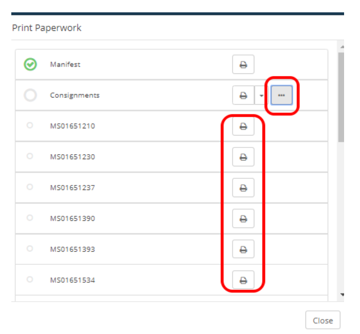 When printing off paperwork for a Manifest, Machship it allows you to download and print multiple consignment note documents and item labels via the Manifest Print Paperwork modal.