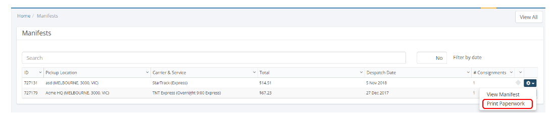 Alternatively, if you are on the View Manifest Page you can select the Print Paperwork button.