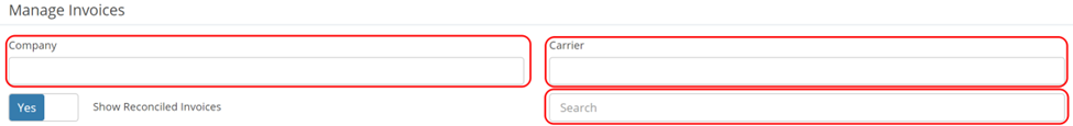 To find your carrier invoice either use the company or carrier filters or the search bar. You are able to search using Invoice Number or File Name.