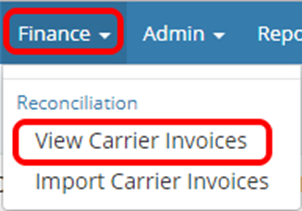 To reprice all consignments on an invoice navigate to the Finance drop-down, and select View Carrier Invoices.