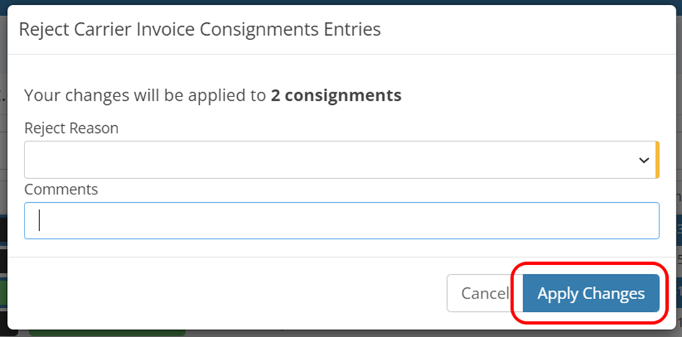 Once complete, select Apply Changes, and the selected consignments will have the full carrier charge rejected.
