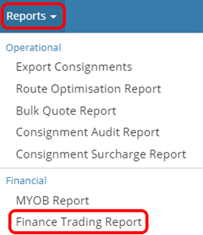 1. Click the Reports drop-down, and select Finance Trading Report.