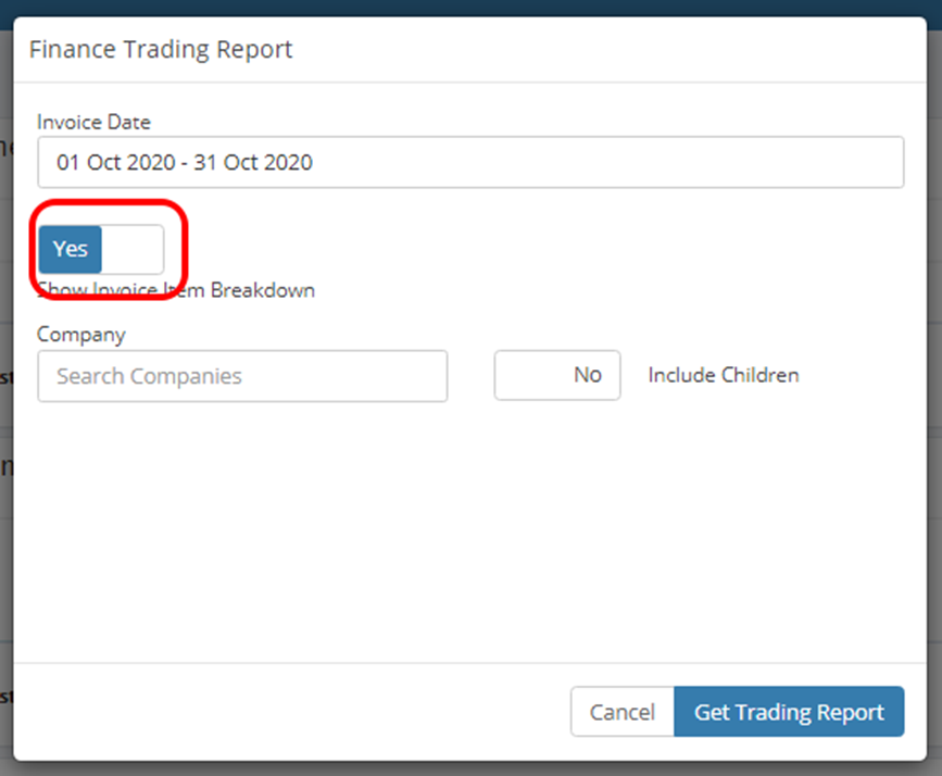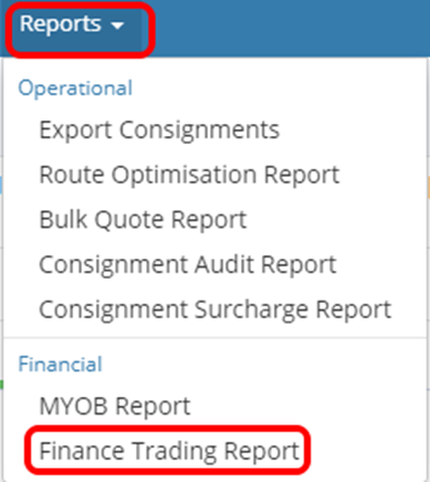 1. Click the Reports drop-down, and select Finance Trading Report.