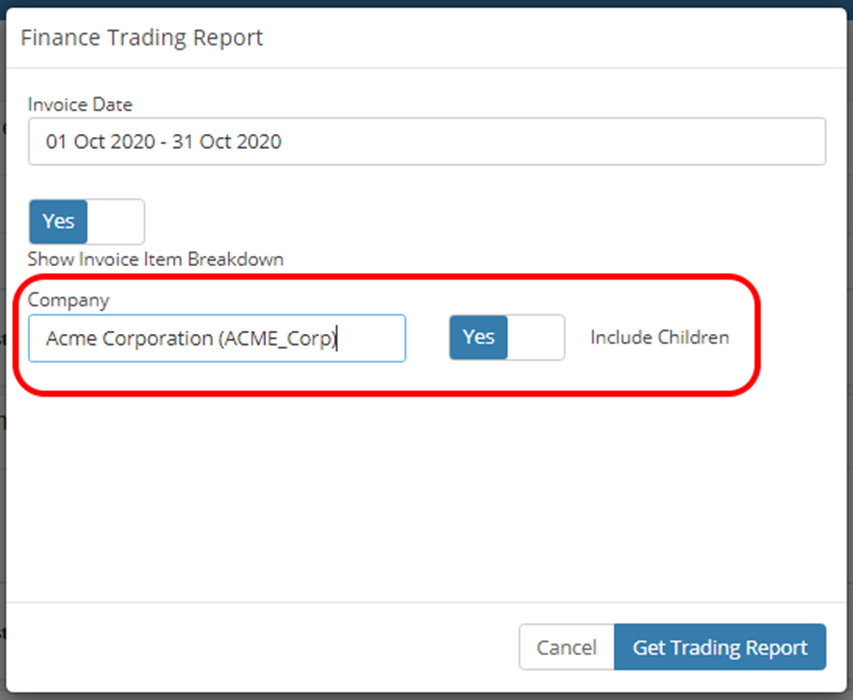 4. Enter in the Company that you wish to run the invoice detail. If you want to run for a whole organisation or company tree then select the Parent Company and the option Include Children
