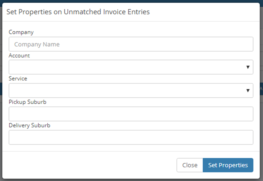 Once the selection method is chosen the Set Properties on Unmatched Invoice Entries modal will show. Here you will select the relevant value for each property. You do not need to fill each field in the modal only those which are applicable to the invoice entries selected.