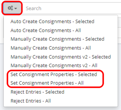 1. Set on Selected - In the far left column, click on the tick next to the consignment you would like to set properties for. Select your invoice entries, click on the Cog to expand the option then scroll down and click on Set Consignment Properties - Selected.