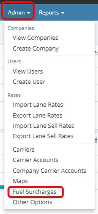 To create a fuel surcharge, navigate to Admin menu and Fuel Surcharges.