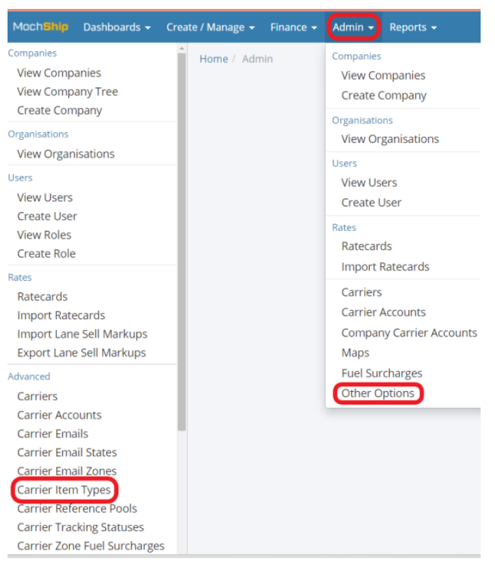 Navigate to Admin and Other Options. Under the Advanced section select Carrier Item Types.