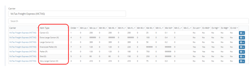 The item type field will be utilised when a set of rates needs to apply based on the dimensions and weights of the items you are sending. This will usually be defined by the carrier as the name of the item type being sent. For example, carton, pallet or skid.