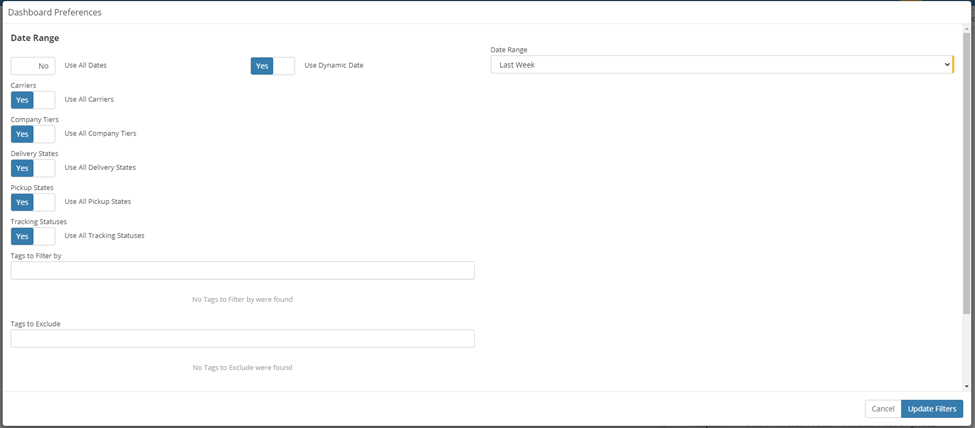 You can add/specify the Tags you wanted it to be filtered to, may it be under Carriers, Companies, Company Tiers, Delivery States, Pickup States and Tracking Statuses.