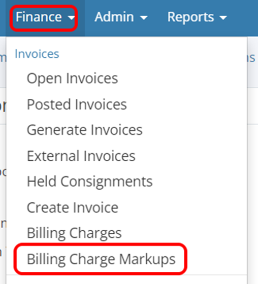 To navigate to create a Billing Charge Mark-up, select Finance and then select Billing Chare Mark-ups