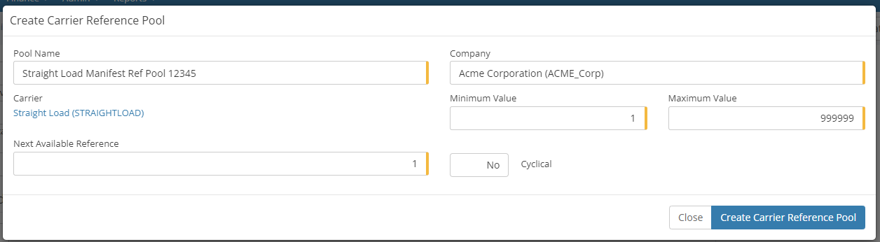 Straight Load requires the creation of 2 reference pools, for the Connote number and Manifest number.To create the reference pool select the Create Carrier Reference Pool button at the bottom of the page.