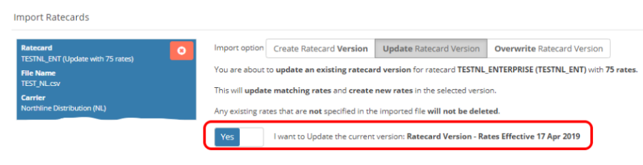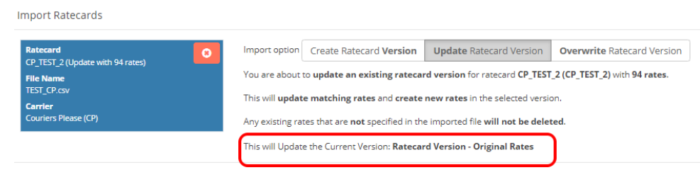If you will be able to update or overwrite a Ratecard Version then the Import Ratecards Modal will appear as below: