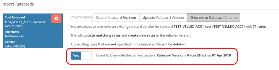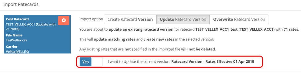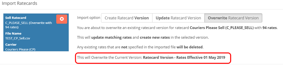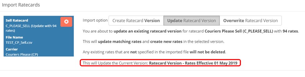If you will be able to update or overwrite a Ratecard Version then the Import Ratecards Modal will appear as below: