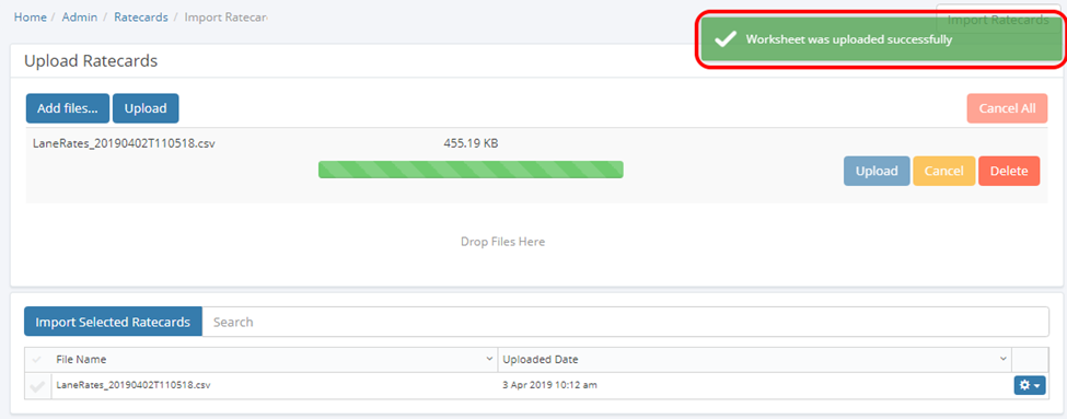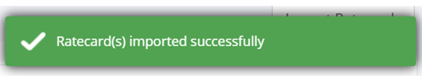 A green Ratecard(s) imported successfully prompt will show in the top right corner of the screen when the import was successful.