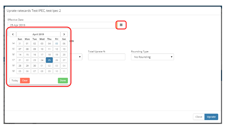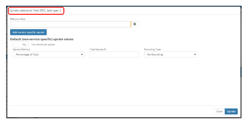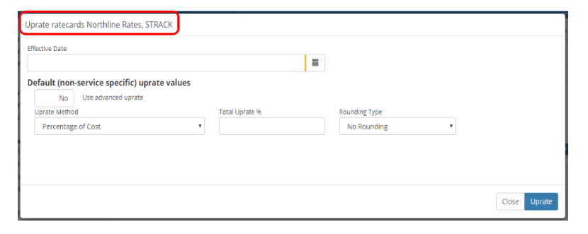 Once the ratecards have been selected, an Uprate modal will appear as below: