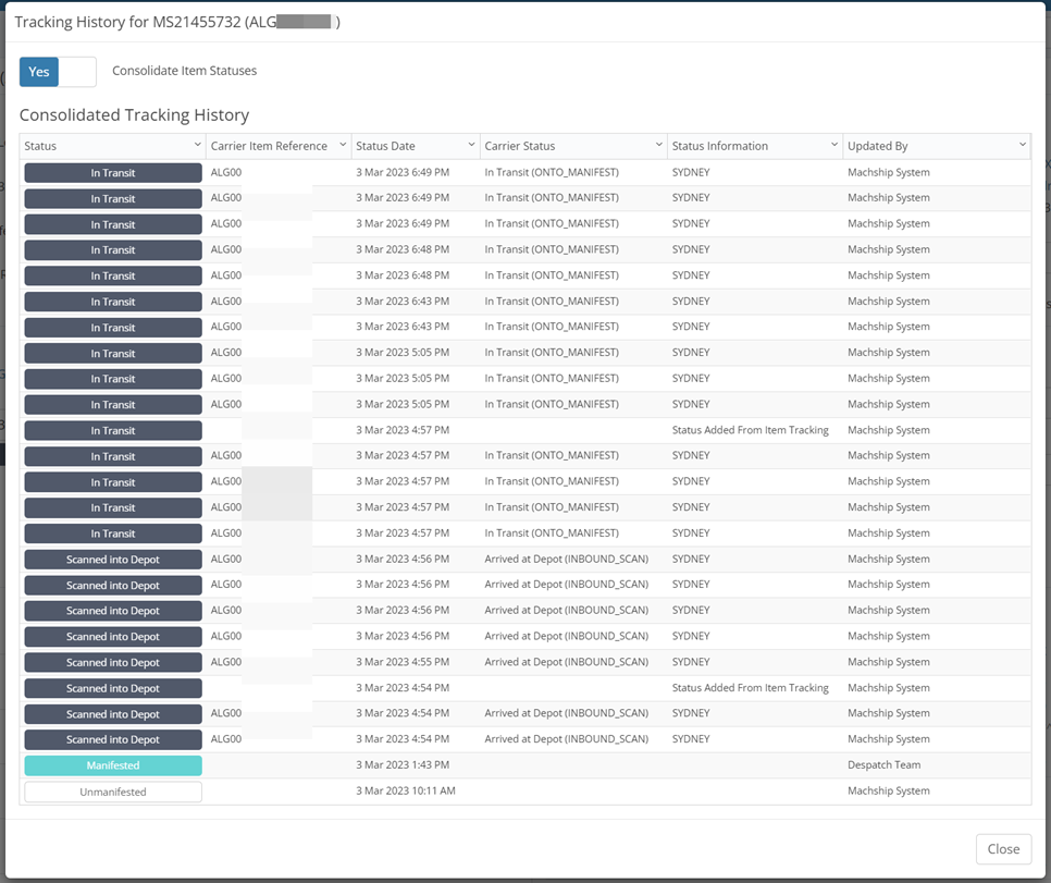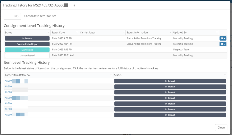 MachShip provides you with the ability to check all the status events of the consignments through the tracking history prompt. However, if the carrier tracking is item-level tracking, MachShip splits the tracking history into consignment level and item level.