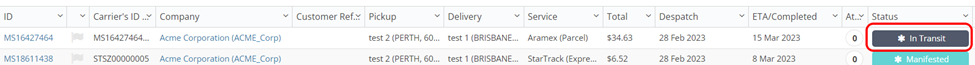 From this screen, select the Consignment you would like to see the tracking history. If there are a few in the list, you are able to refine the search by entering any details regarding the consignment in the search engine, as highlighted in the image below. You can also utilise any of the filters for Company, Carrier, Destination State or Date (both ETA and Despatch).