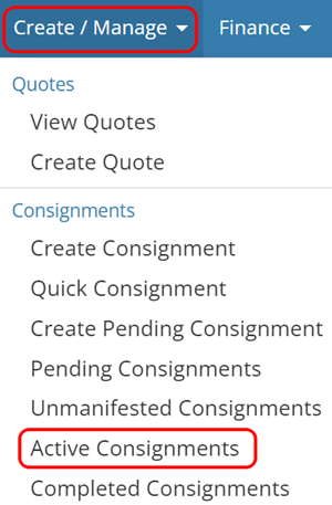 To navigate to this screen, from the top menu select Create/Manage, scroll down to the Consignments section and click Active Consignments.