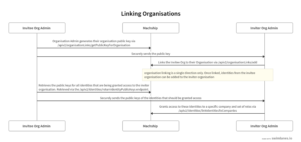 Once the Organisation Admin of the Inviter Organisation has the public key, they need to link the invitee organisation using that key. Note that organisation linking is single direction only. Once linked, identities from the invitee organisation can be added to the Inviter organisation, however the reverse is not allowed. To allow this, Step 1 and 2 would need to be completed in reverse.