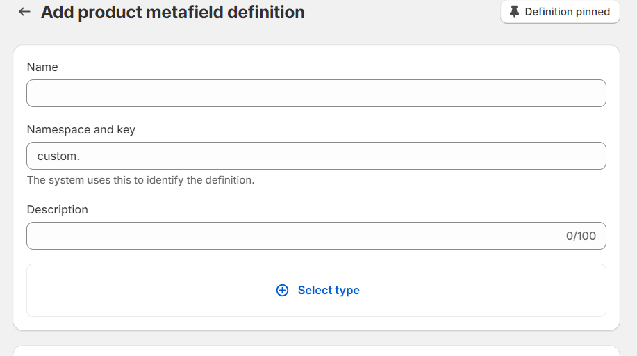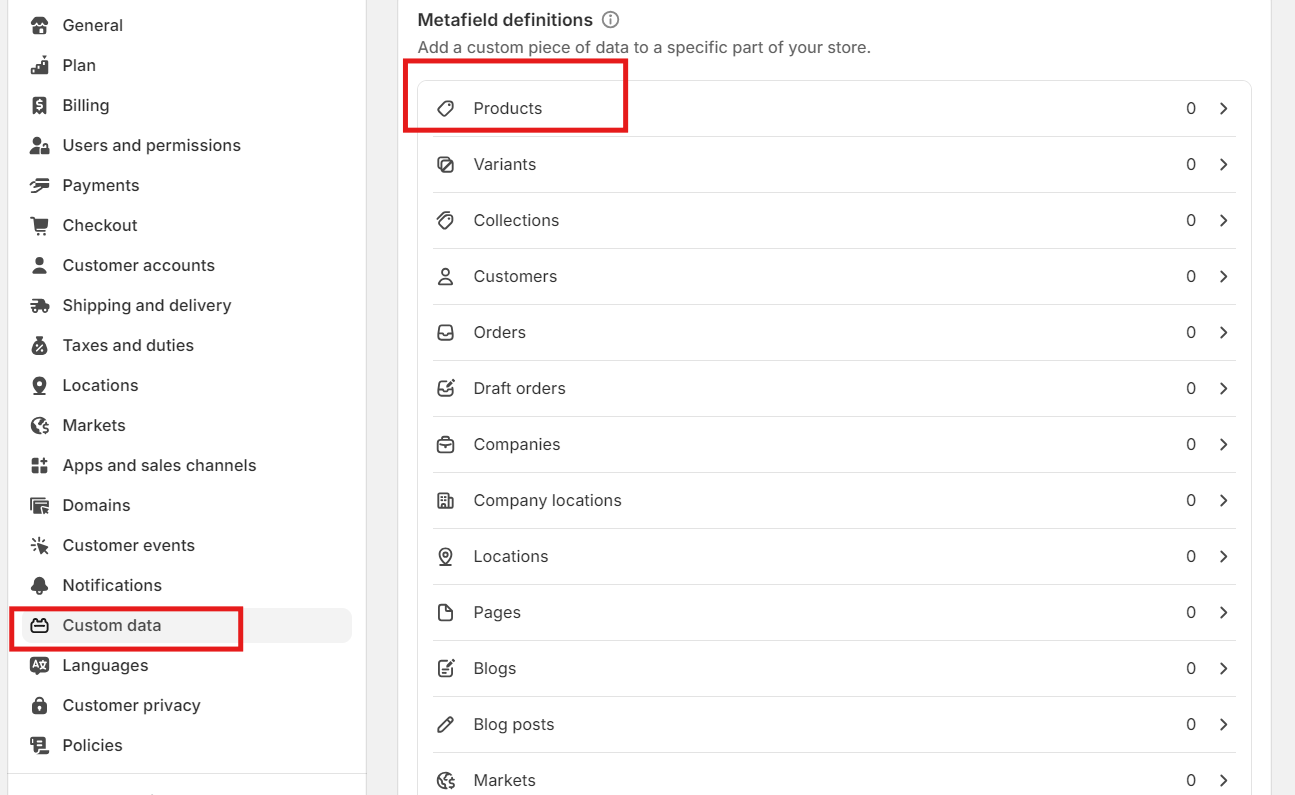 in to the Shopify admin and go to Settings > Custom data > Products