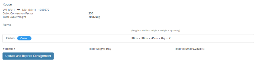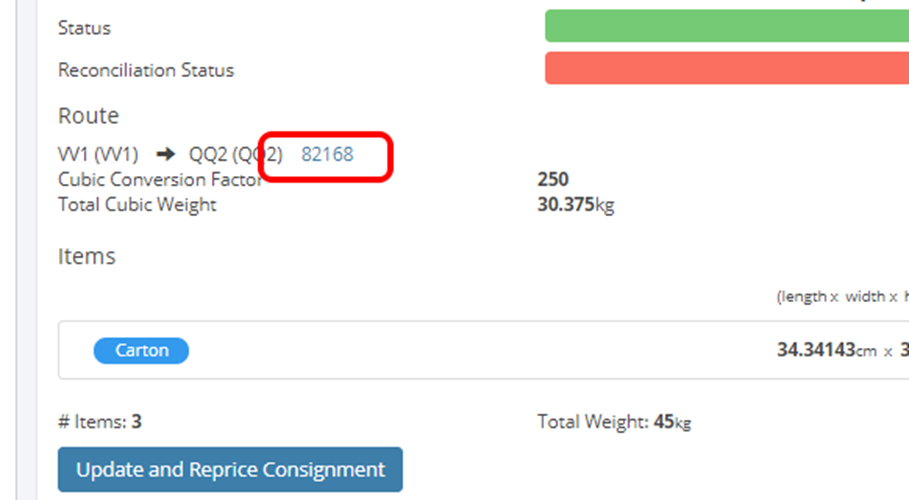 To ascertain if this is the reason for the charge discrepancy compare the weight, cube, cubic weight, and quantity provided by the carrier in the Items section(shown as the first image below), to the amount which was placed into MachShip (shown as the second image below).