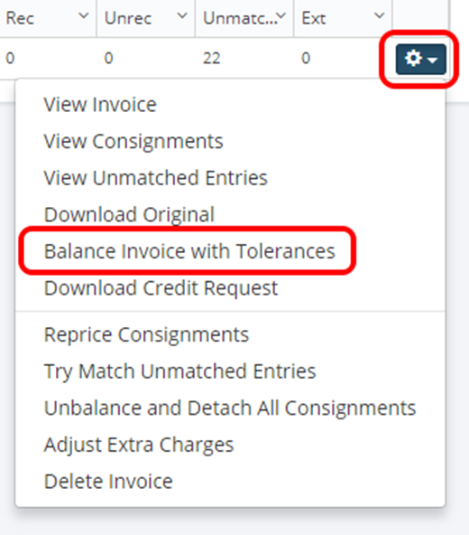 Once you have found the carrier invoice select the drop-down cog on the right-hand side and select Balance invoice with Tolerances.