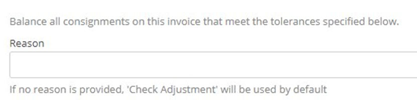 Fill out the reason field. This will be the reason applied to the reconciliation charges on consignments which balance with these tolerances. If left blank, the system will set as check adjustment. If you aren't invoicing out of the system you can keep this field blank.