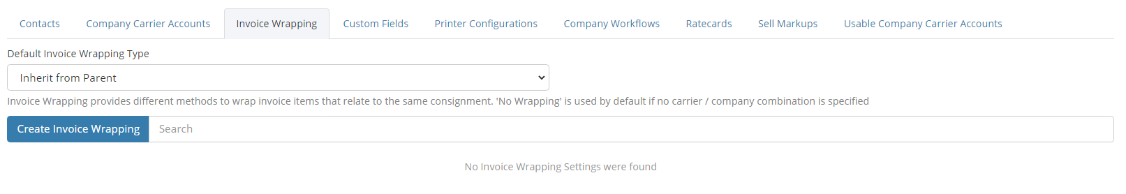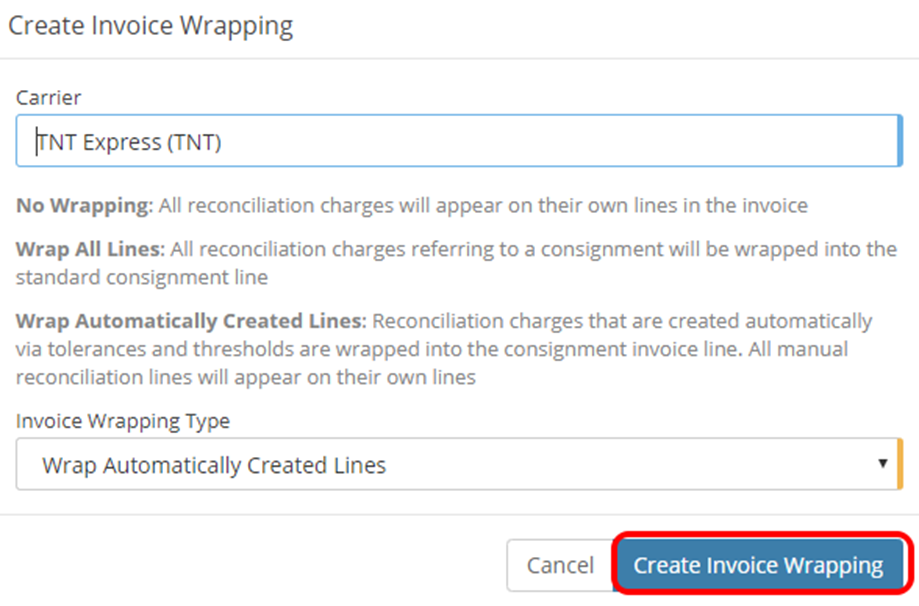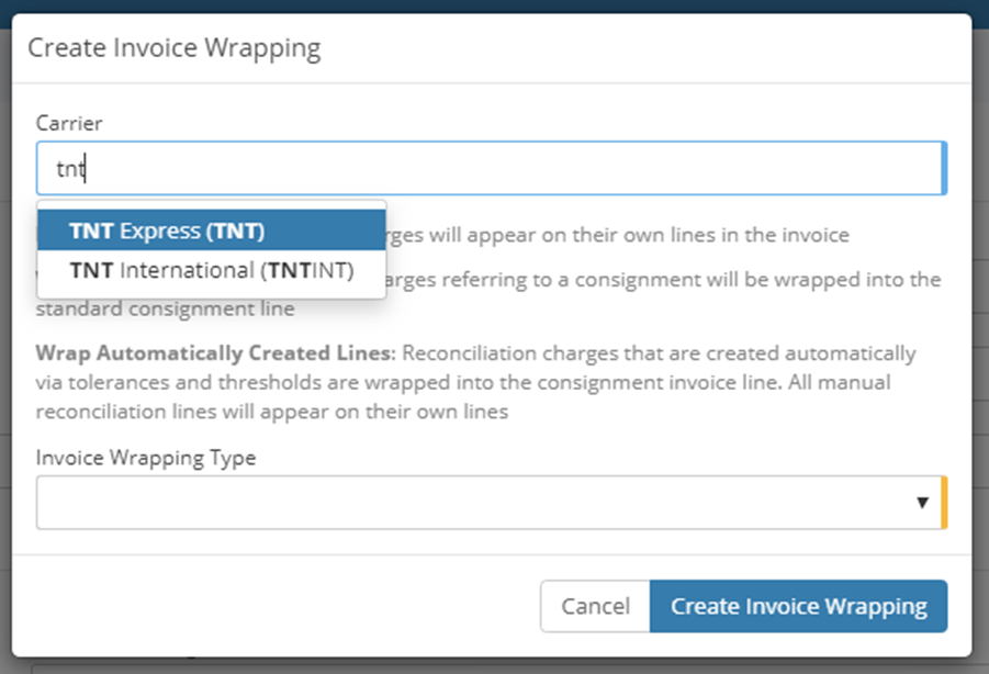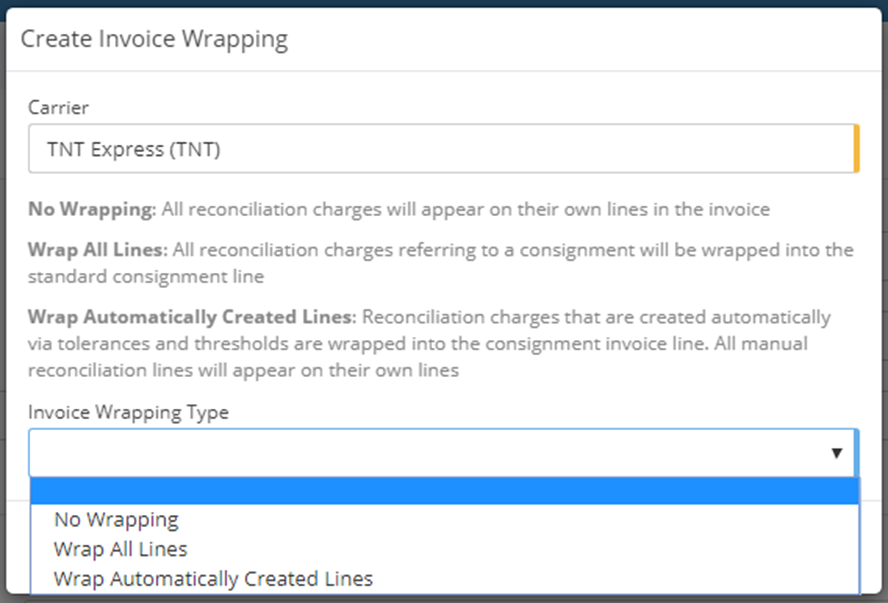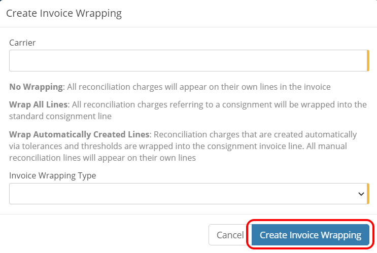 If you wish to set up a Specific set of Invoice Wrapping for a carrier this is completed through the Create Invoice Wrapping modal.