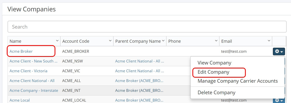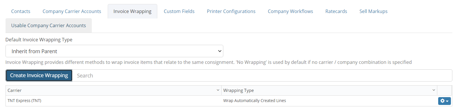 Search for the company you wish to set up the Invoice Wrapping, select the cog on the right and the Edit Company option.