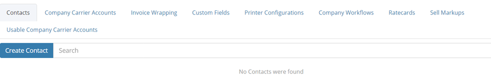 About three quarter's down the page you will see the Company Information Table. This table contains information relating to Contacts, Company Carrier Accounts, Invoice Wrapping, Custom Fields, Printer Configurations, Workflows, Ratecards, Sell Markups and Usable Company Carrier Accounts.