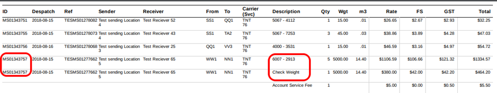 In the above example, there are 2 line items highlighted, the second of which shows a $380 excess fee due to check weight.
